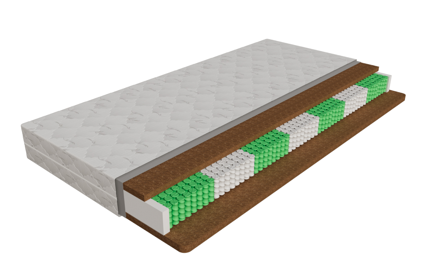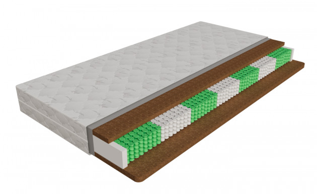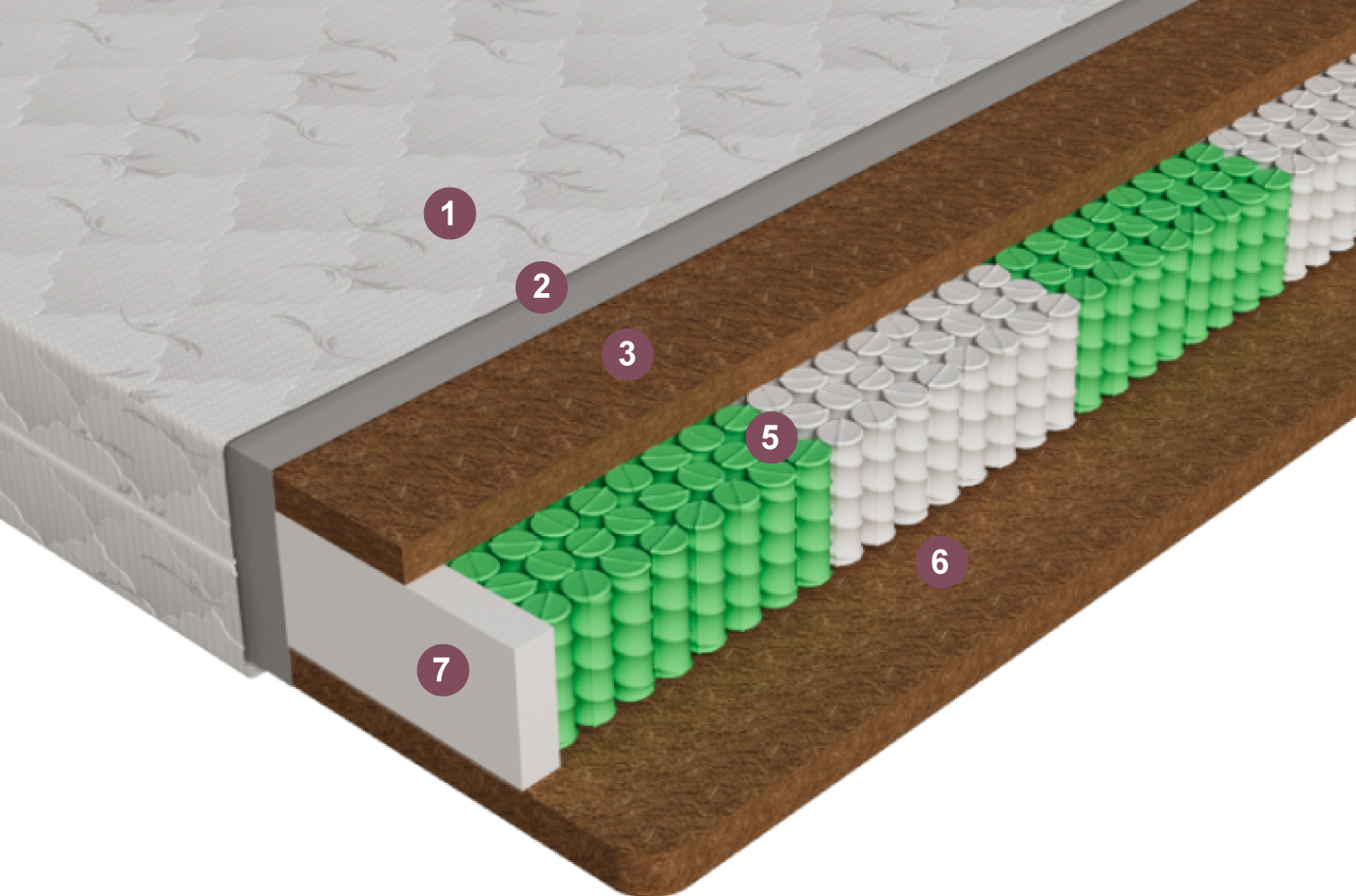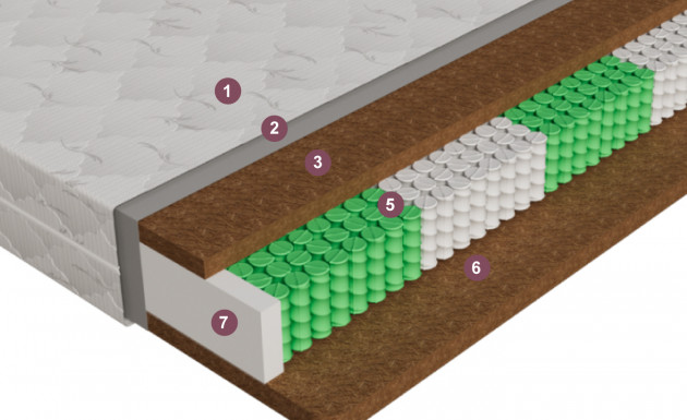 Высота 23, нагрузка - 130кг, 256 пружин на квадрат 1 Стеганый чехол 2 Мебельная сетка 3 Кокосовая койра - 40мм 4 "Зональный блок независимых пружин 140 мм - Zonal Comfort" 5 Кокосовая койра - 40мм 6 Усиленный периметр 80