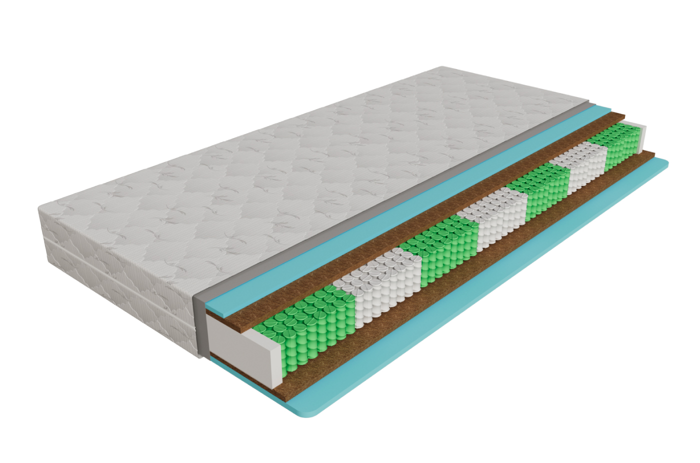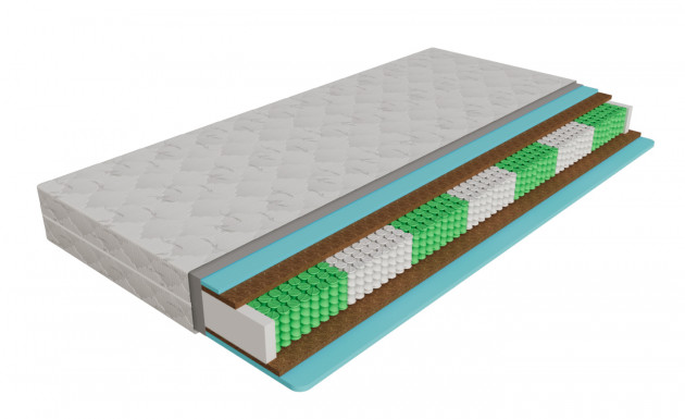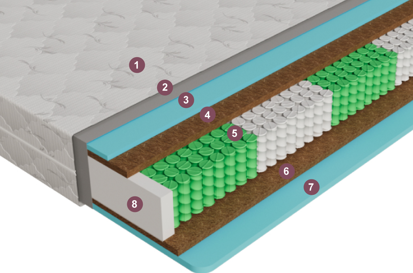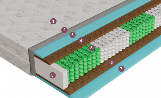 Высота 23, нагрузка - 130кг, 256 пружин на квадрат 1 Стеганый чехол 2 Мебельная сетка 3 memory foam - 20мм 4 Кокосовая койра - 20мм 5 "Зональный блок независимых пружин 140 мм - Zonal Comfort" 6 Кокосовая койра - 20мм 7 memory foam - 20мм 8 Усиленный периметр 80